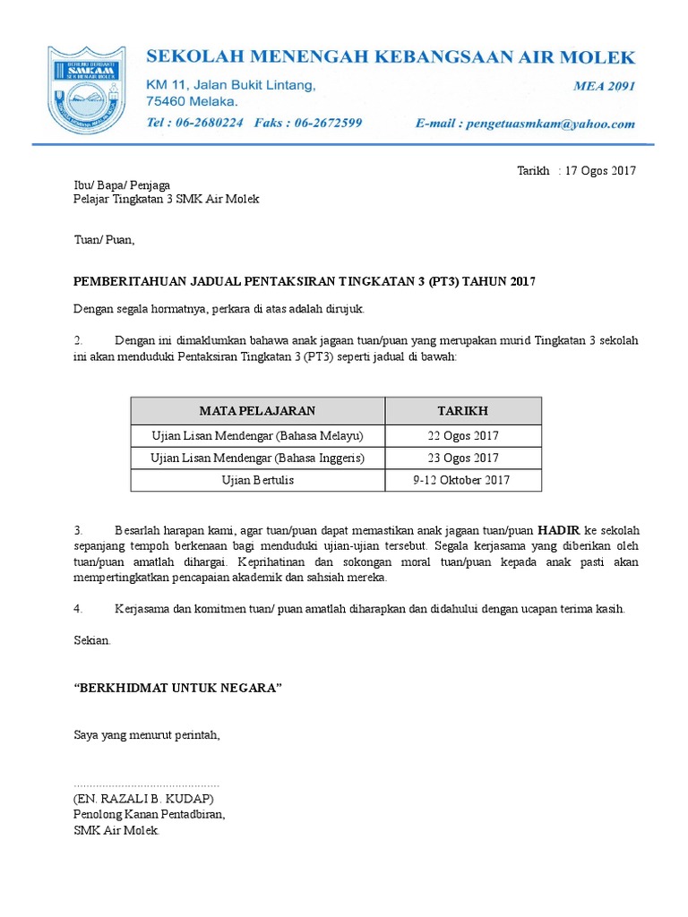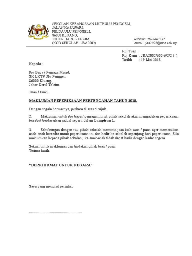 Contoh Surat Rasmi Tidak Dapat Hadir Ke Peperiksaan